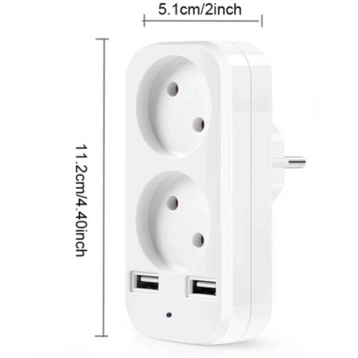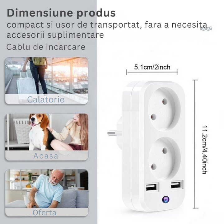 Adaptorul se potriveste in majoritatea spatiilor, fiind compatibil cu prizele standard. Cu doua prize electrice clasice si porturi USB DC5V 2100mA, poate alimenta laptopuri, telefoane, imprimante si alte echipamente electronice. Putere maxima: 10A, tensiune: 250V