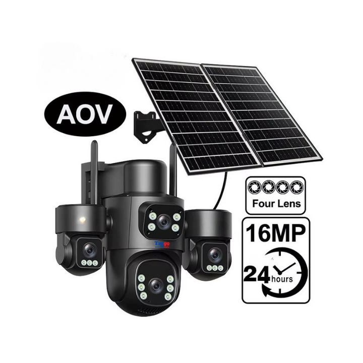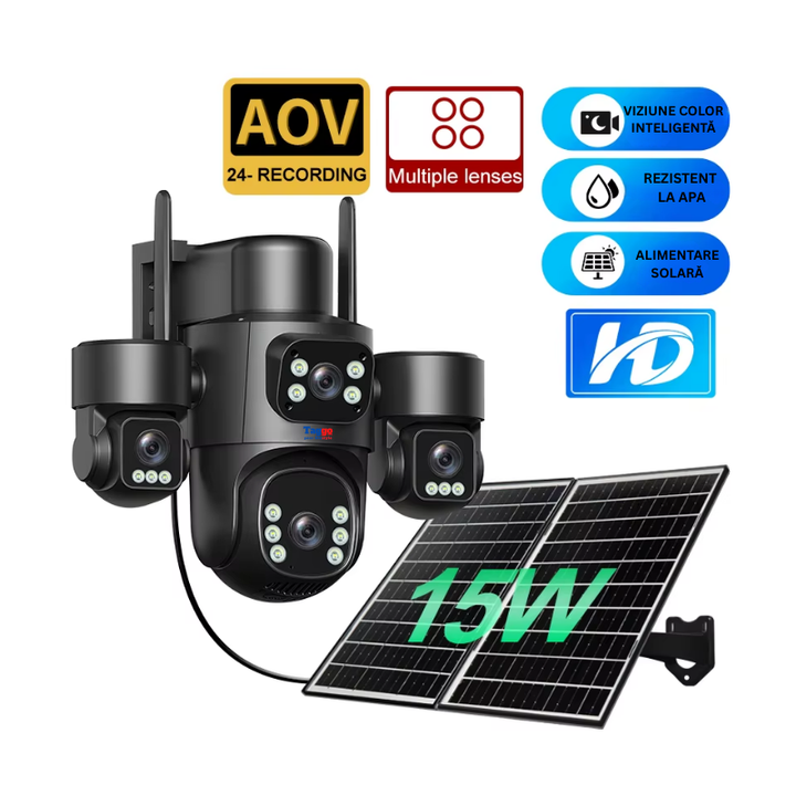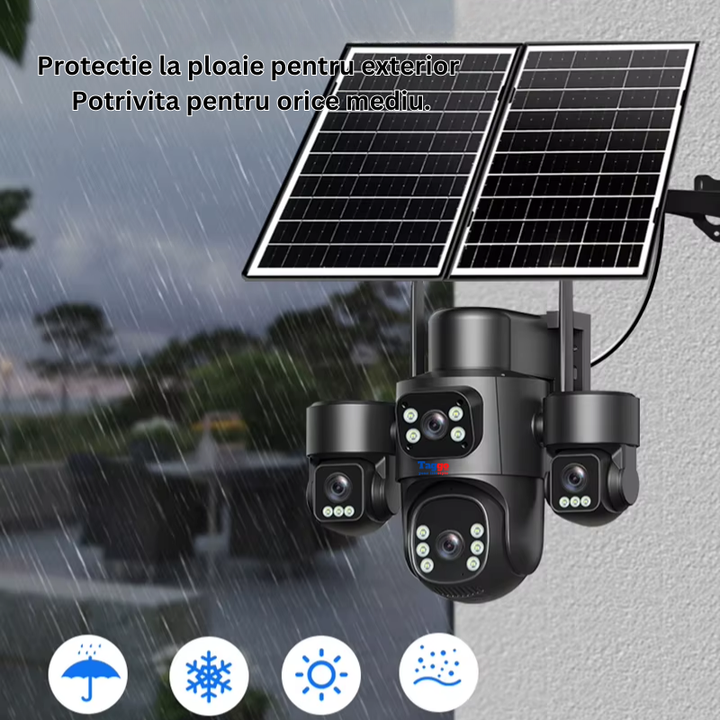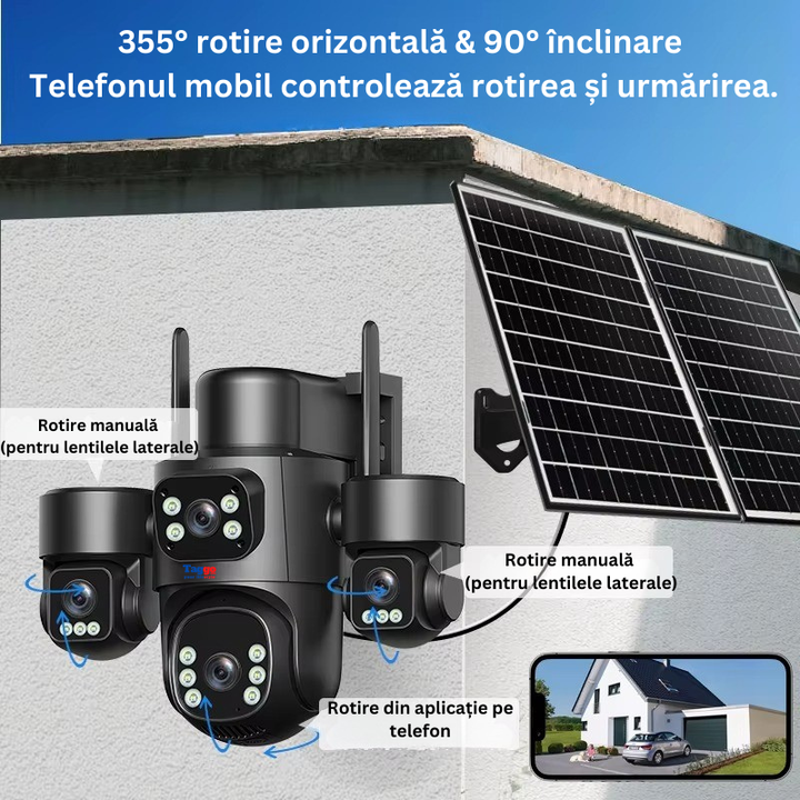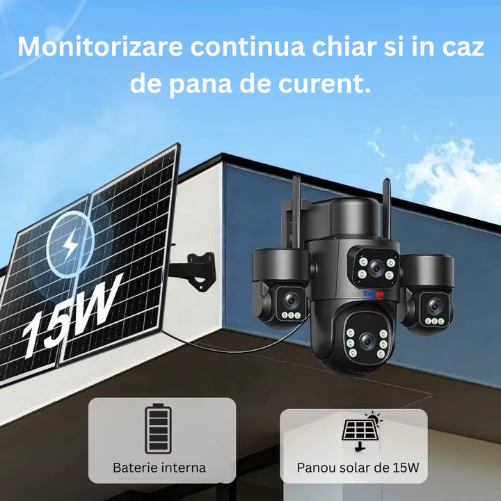 Protejeaza-ti locuinta, curtea sau afacerea cu Camera de Supraveghere 4G Solara cu 4 lentile si rezolutie 16MP. Cu alimentare solara non-stop, viziune nocturna color, comunicare bidirectionala si conectivitate 4G, aceasta camera iti ofera siguranta completa, fara cabluri si fara griji.