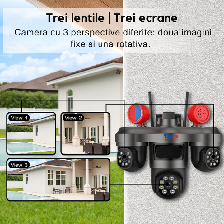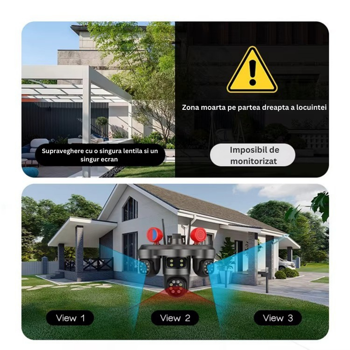 • ✅ Unghi de vizualizare: 355° + 355° + 355° (acoperire panoramica prin cele 3 lentile)