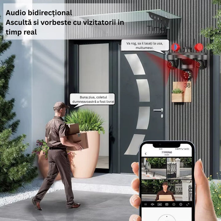 • ✅ Functii speciale: Detectie miscare, viziune nocturna, urmarire automata a persoanelor, rezistenta la apa si intemperii, Pan–Tilt, audio bidirectional, acces si vizualizare de la distanta