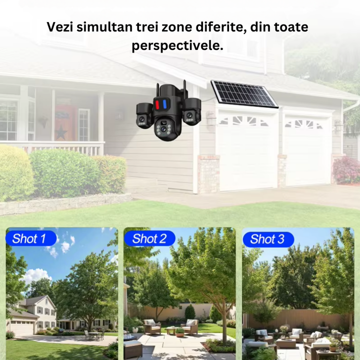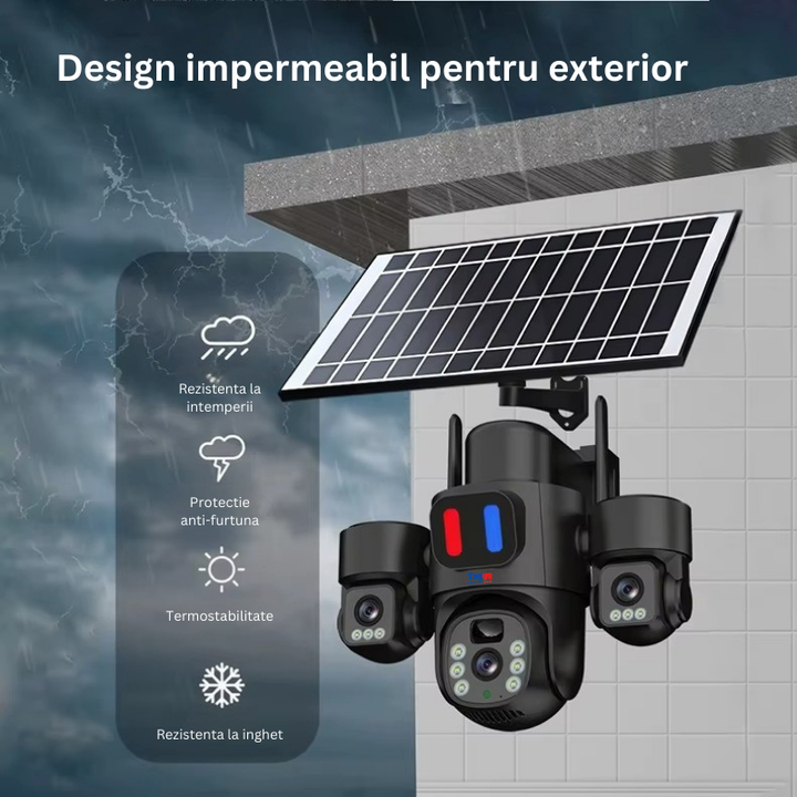 Protejeaza-ti locuinta, curtea sau afacerea cu Camera de Supraveghere WiFi cu 3 lentile si panou solar. Cu rezolutie 12MP, viziune nocturna color, comunicare vocala bidirectionala si alimentare solara non-stop, aceasta camera iti ofera siguranta completa, fara cabluri si fara griji.