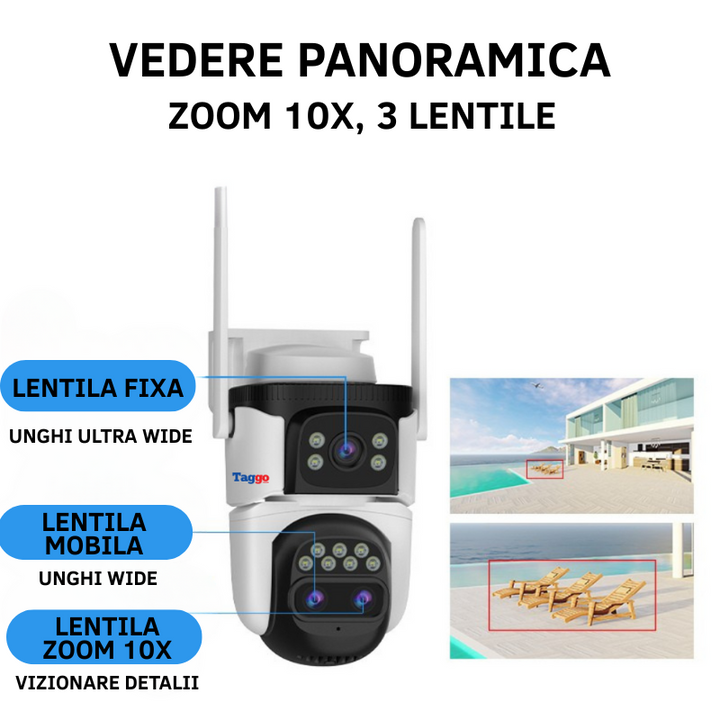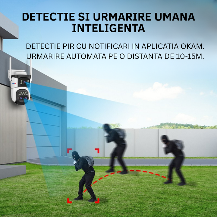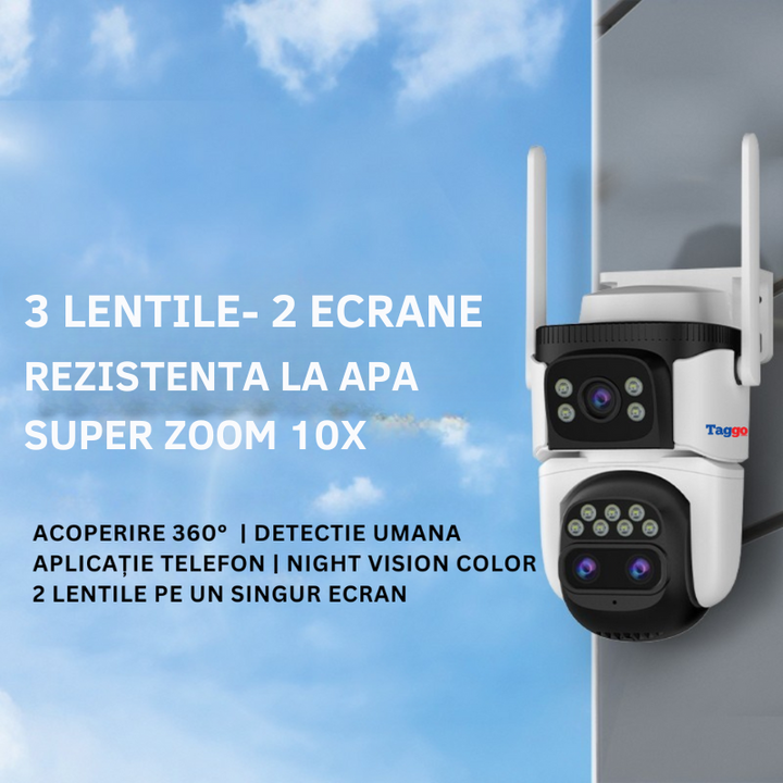 Set 3x Camere Supraveghere WiFi, 3 Lentile, 6K Ultra HD, 12MP, Zoom Hybrid 10x, Urmarire Automata, Control din Aplicatie